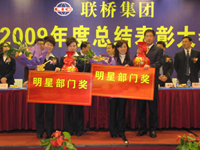 董海波副總經(jīng)理首先宣讀了《聯(lián)橋集團關(guān)于表彰2009年度先進的決定》,授予進口部“卓越貢獻獎”,紡織八部、紡織九部“明星部門獎”,紡織二部等10個部門“先進部門獎”,授予徐建禮等10名員工“敬業(yè)精英”,孫永進等27名員工“先進個人”,董文忠、張建軍2名員工“團隊協(xié)作獎”榮譽稱號。頒獎儀式結(jié)束后,獲獎部門代表進行了大會發(fā)言,總結(jié)了2009年各項工作,匯報了2010年工作計劃。